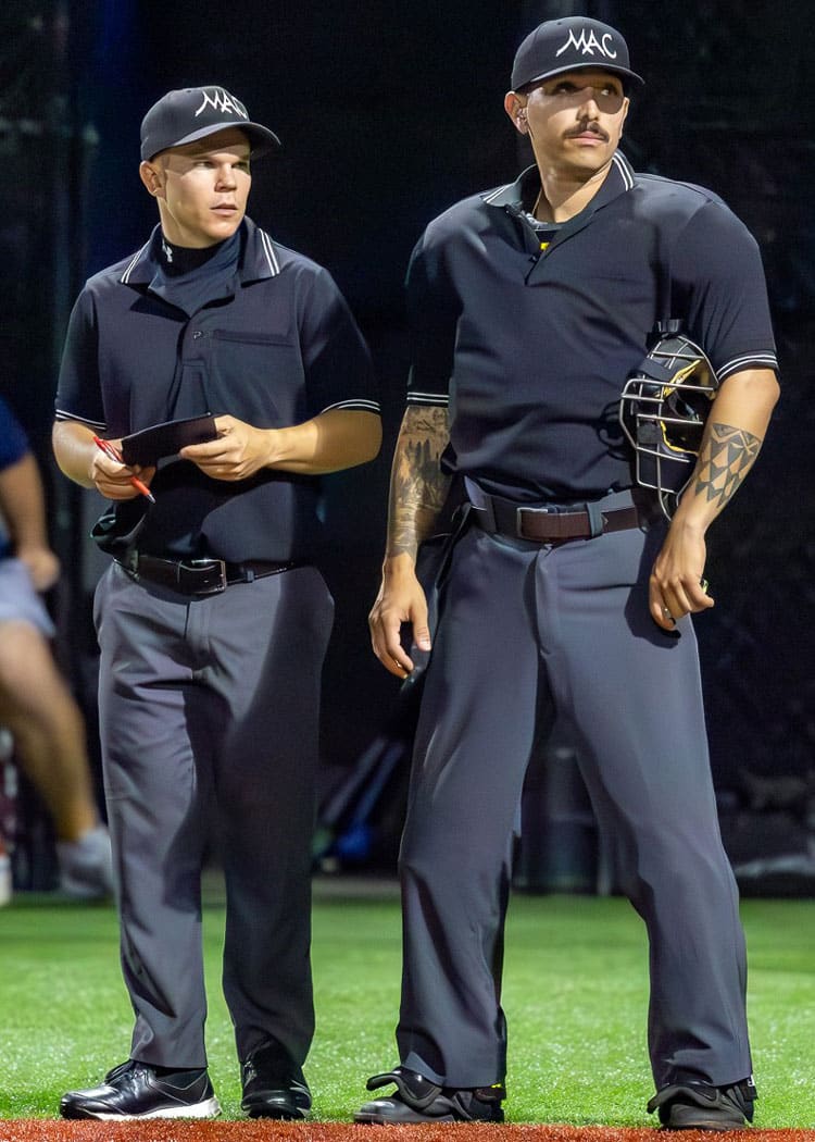 Andrew Mack and David Roche Rodriguez umpired together at Patriot Park. Here they are meeting in-between innings.